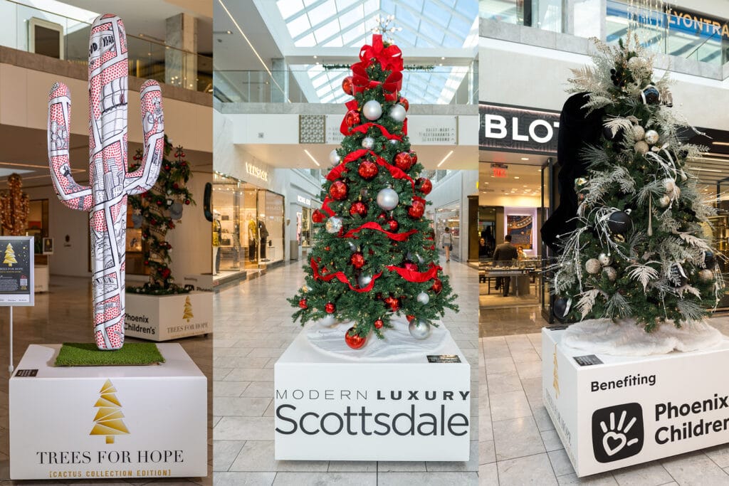 Scottsdale Fashion Square presents Trees of Hope within the Crystal Court each year. Local florists, retailers and designers decorate holiday-themed trees, wreaths and cacti that are displayed early in the holiday season so shoppers can see them and bid on them. The money raised goes toward Phoenix Children’s Hope Fund, a critical source of funding for the areas of greatest need.