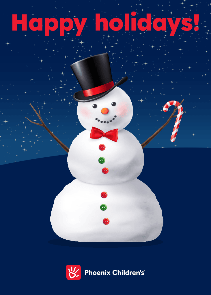 Brighten the day of a Phoenix Children’s patient with a delightfully cheerful holiday card! Your message of hope and encouragement will be hand-delivered to a child in the hospital—just in time to spread festive joy. Choose from three adorable designs featuring friendly faces ready to deliver smiles and holiday cheer!